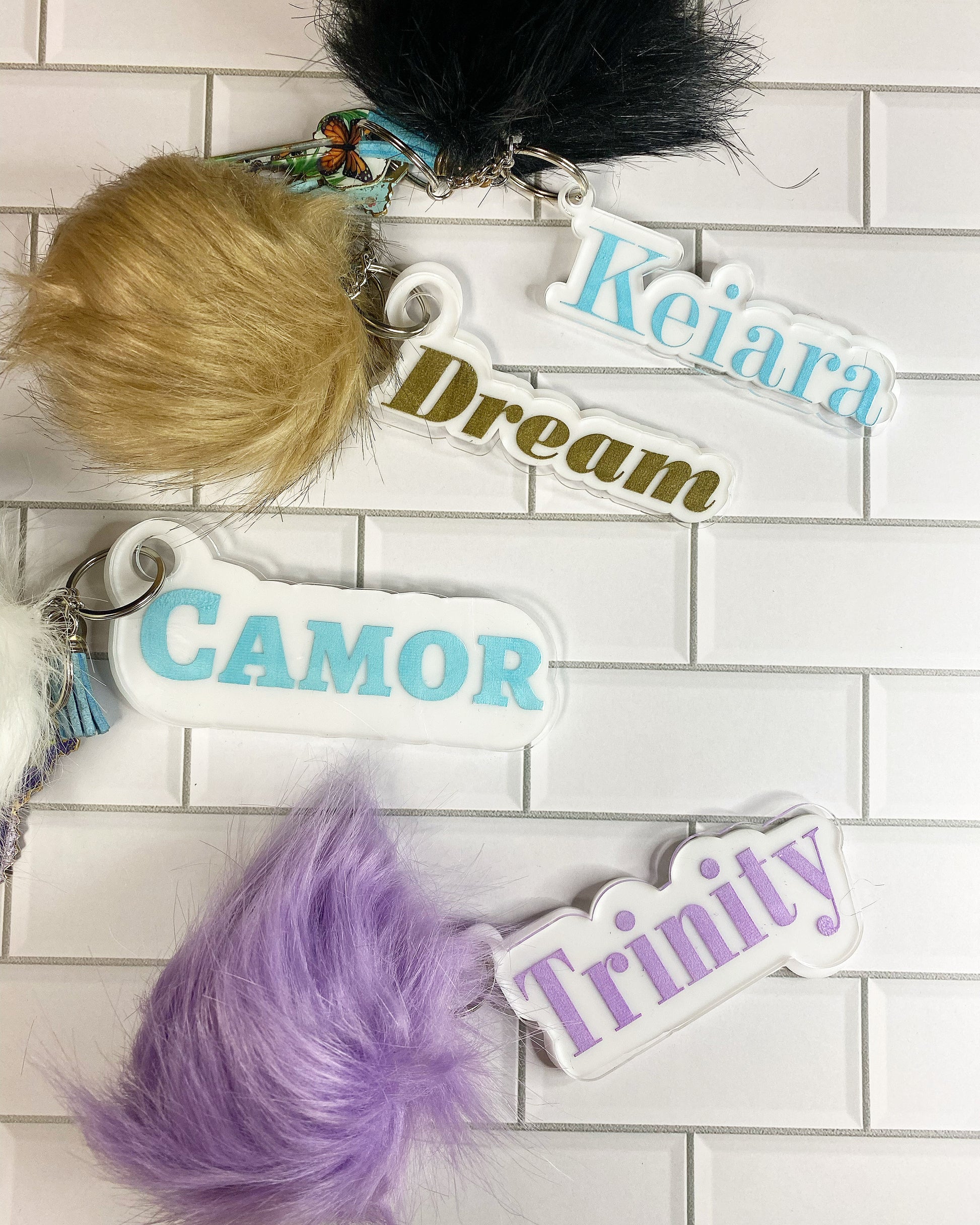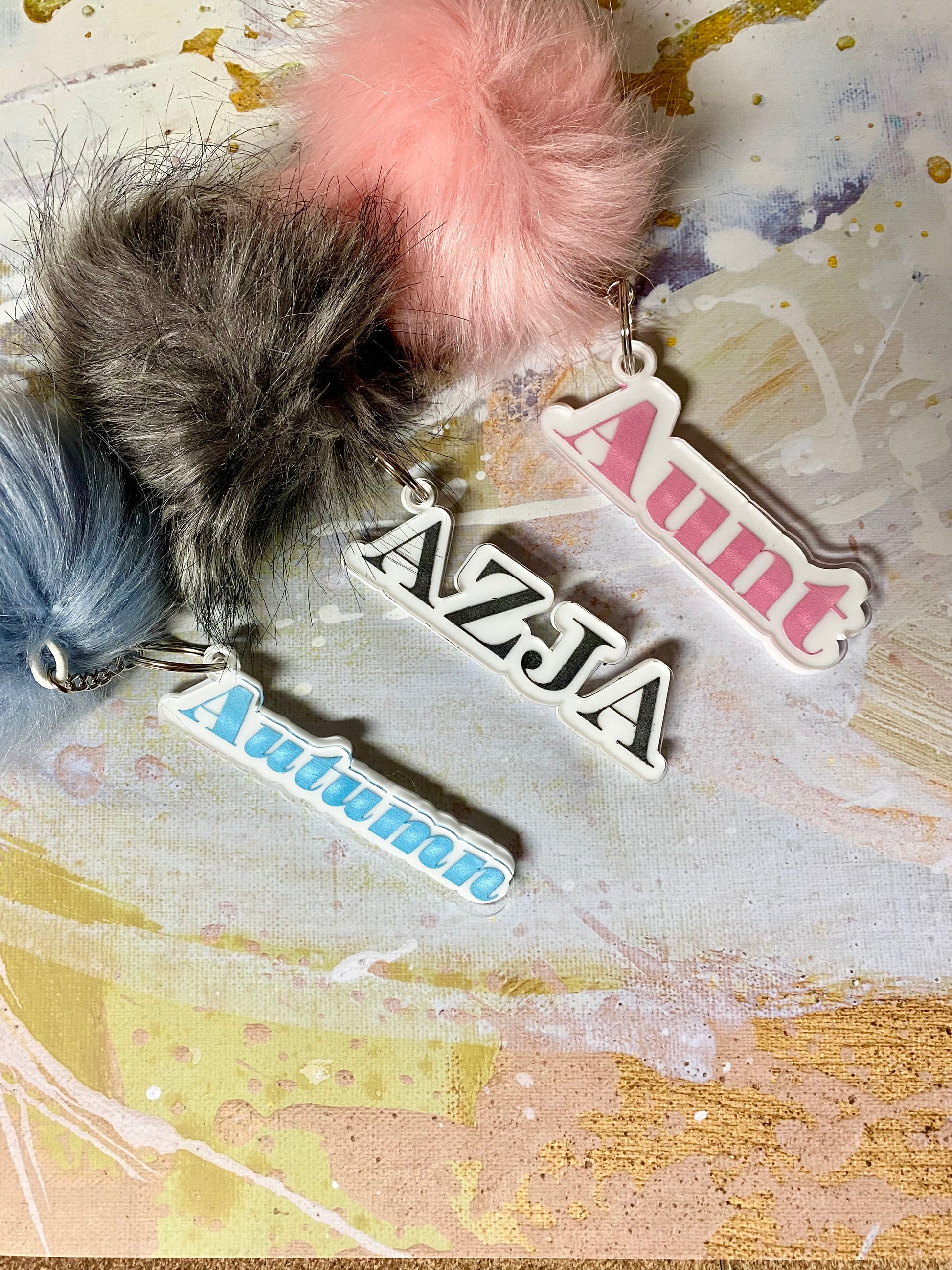 Custom name keychains with clear acrylic and white backing. Choose color of choice and name
